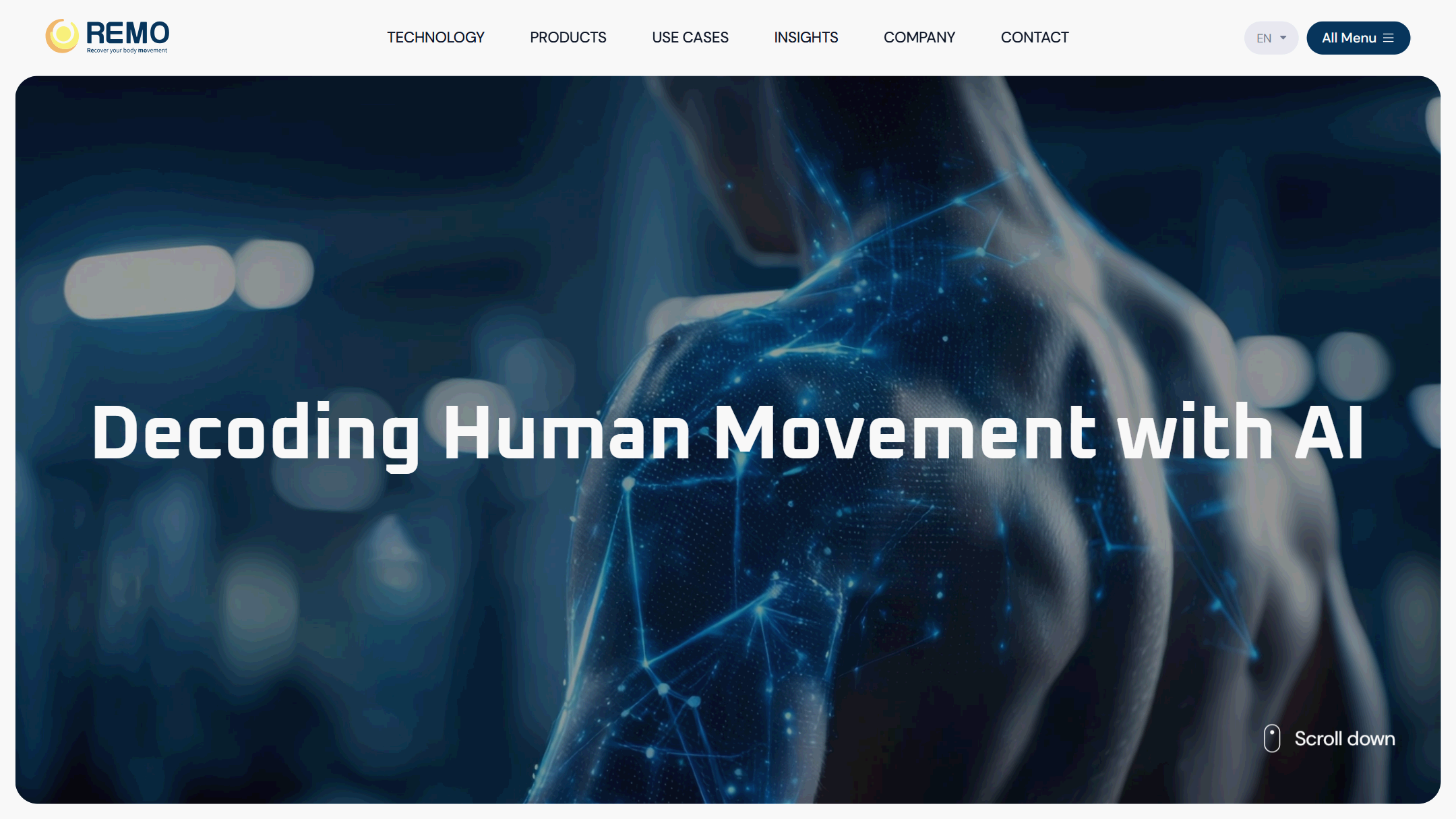 웹사이트 전반에 활용된 모션 그래픽은 실제 리모의 API가 작동하는 방식을 그대로 모사합니다. 인체의 관절 포인트를 추적하고 움직임의 궤적을 선으로 그려내는 시각 효과는 브랜드가 보유한 기술적 자신감을 상징합니다. 사용자는 웹사이트를 탐색하는 것만으로도 리모의 AI가 자신의 움직임을 어떻게 이해하고 해석하는지에 대한 기술적 신뢰를 획득하게 됩니다.